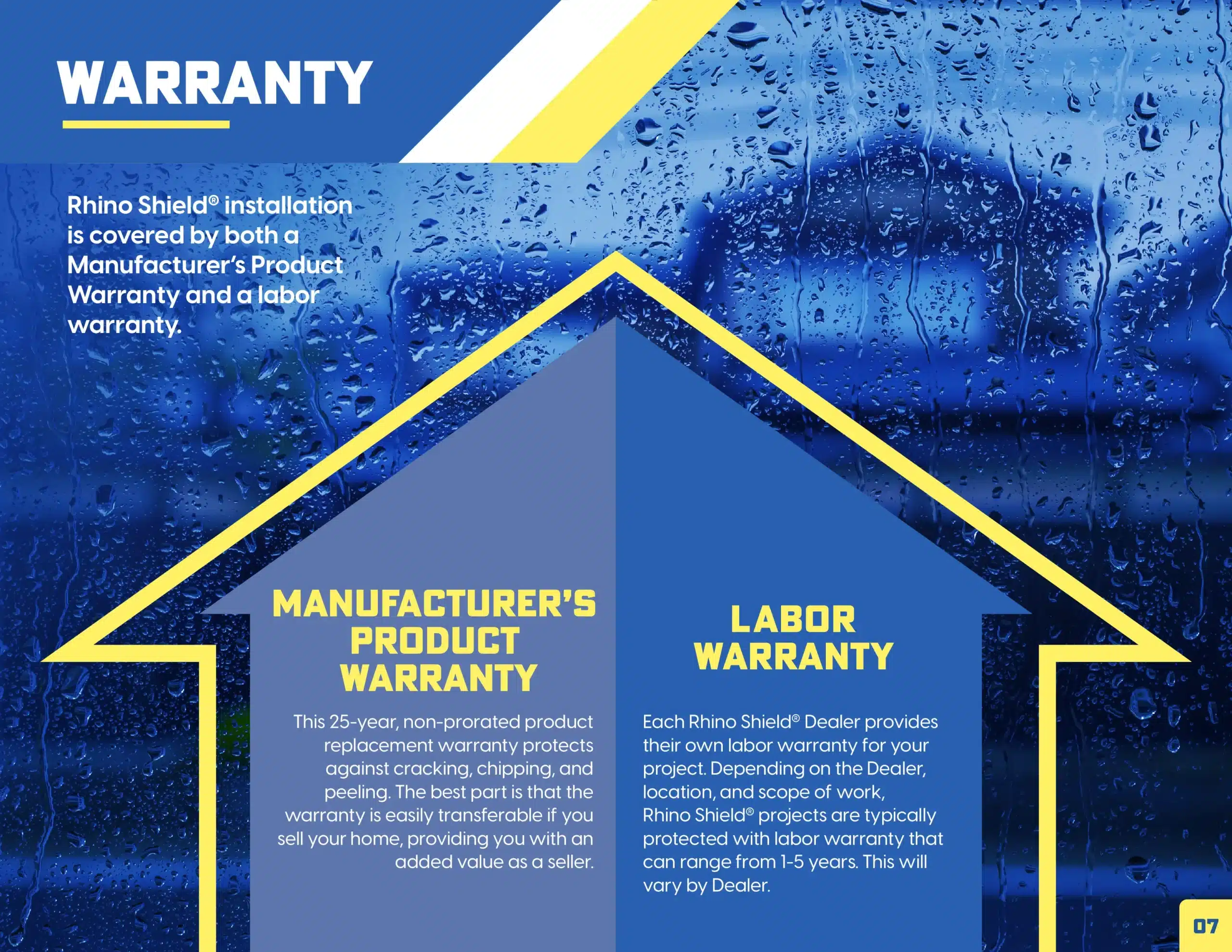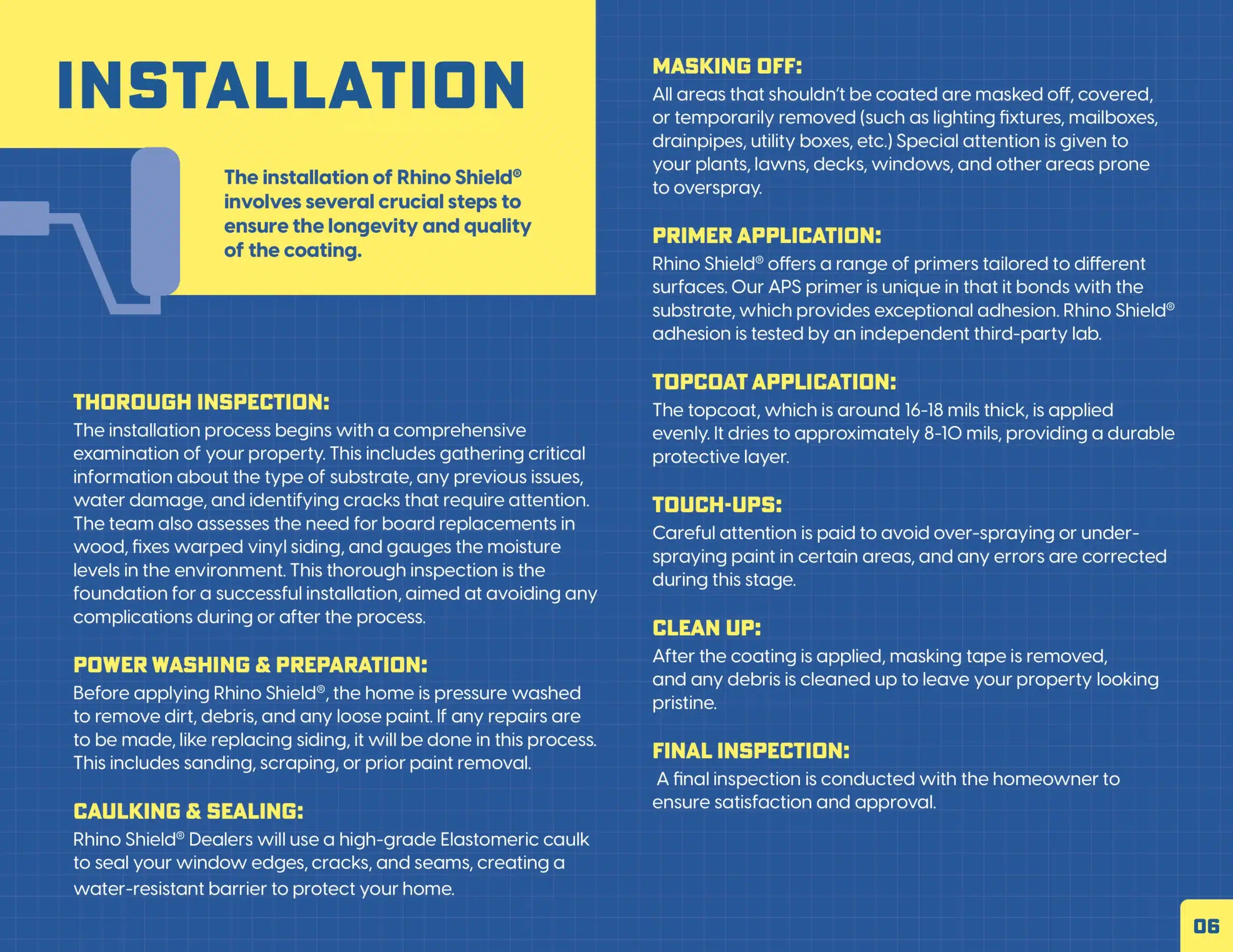 The RhinoShield ceramic finish coat is applied at a high mill thickness for exceptional durability, with careful touchups and complete cleanup afterward. A final inspection confirms quality, and homeowners receive a 25-year no-chip, crack or peel warranty for lasting peace of mind.